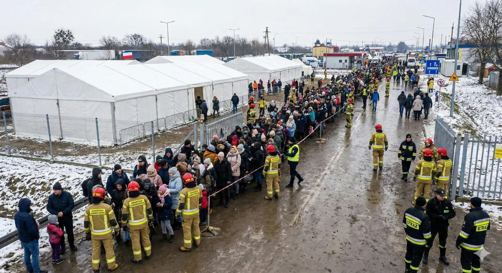 Phase 1 (Schock): Einrichtung von Hotspots für die Erstaufnahme am Grenzübergang Medyka. Verteilung von warmem Essen, Thermodecken und erster medizinischer Versorgung für Frauen und Kinder, die nach dem Grenzübergang zu Fuß bei Minustemperaturen ankamen.